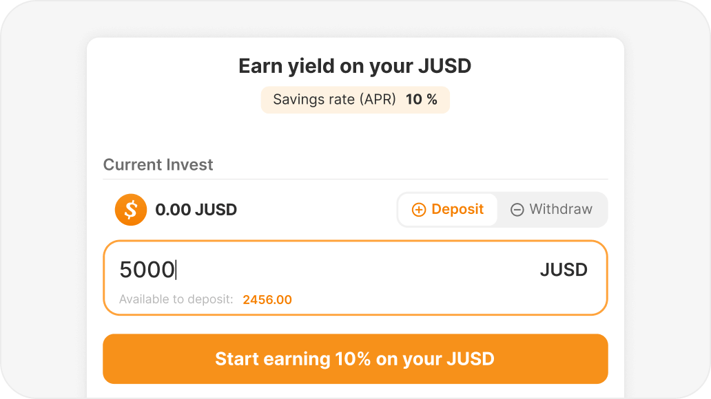 Connect your wallet with the JUSD App and deposit your JUSD into the Savings module to start earning a stable 10% APR — automatically, block by block.